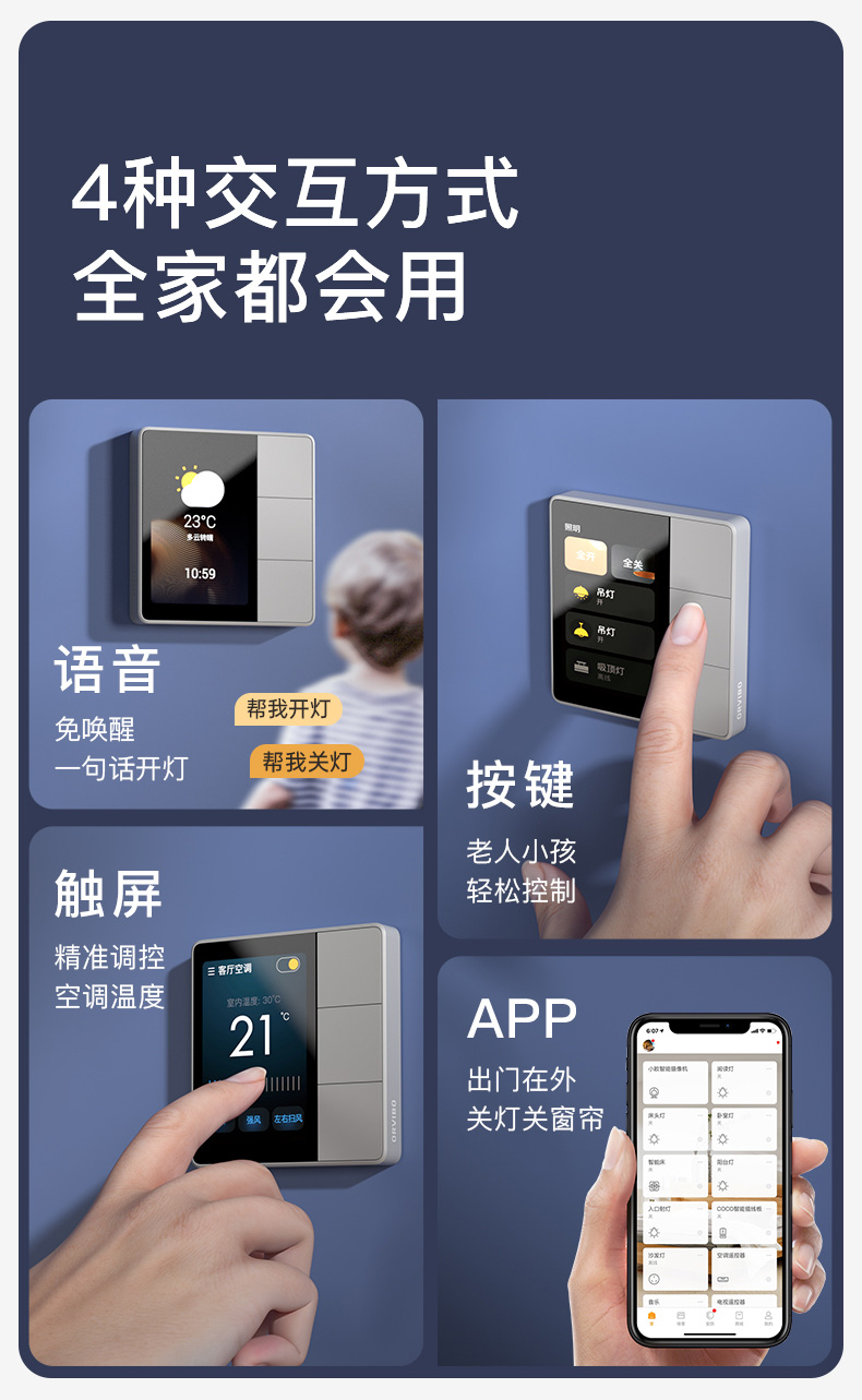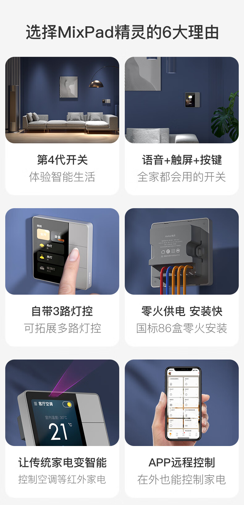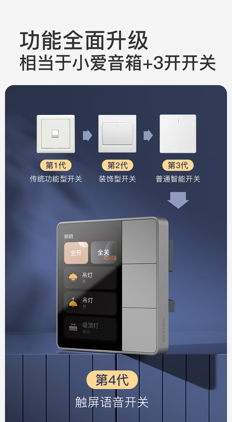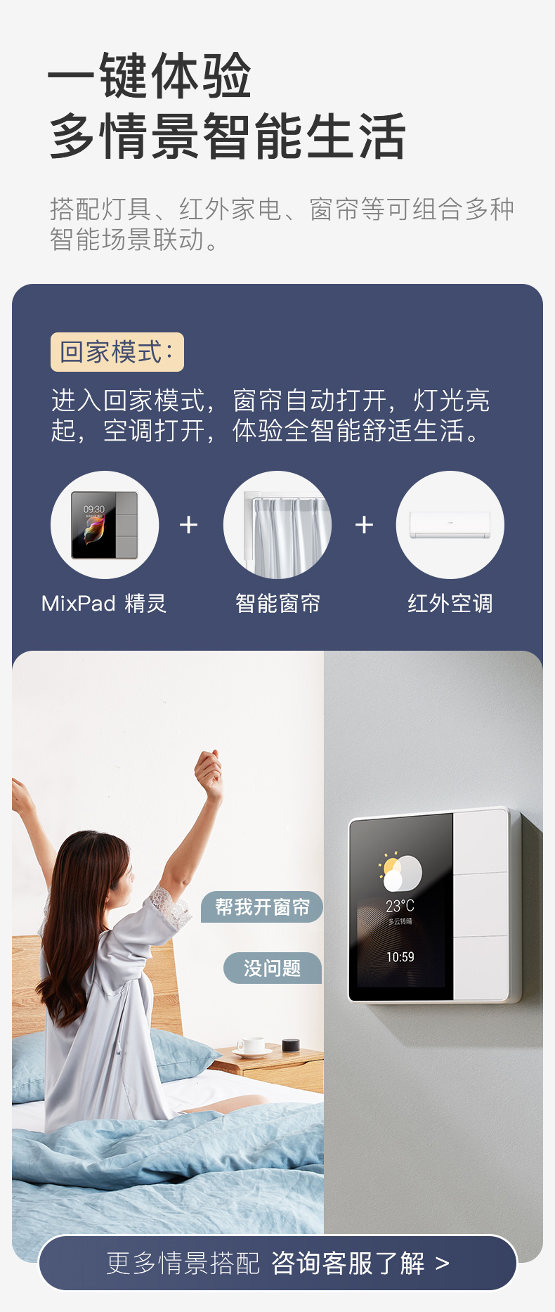 欧瑞博MixPad精灵智能开关可声控开关灯遥控开关免布线安装开关插座86型底盒支持精灵音箱 触屏语音开关(零火)-星空灰