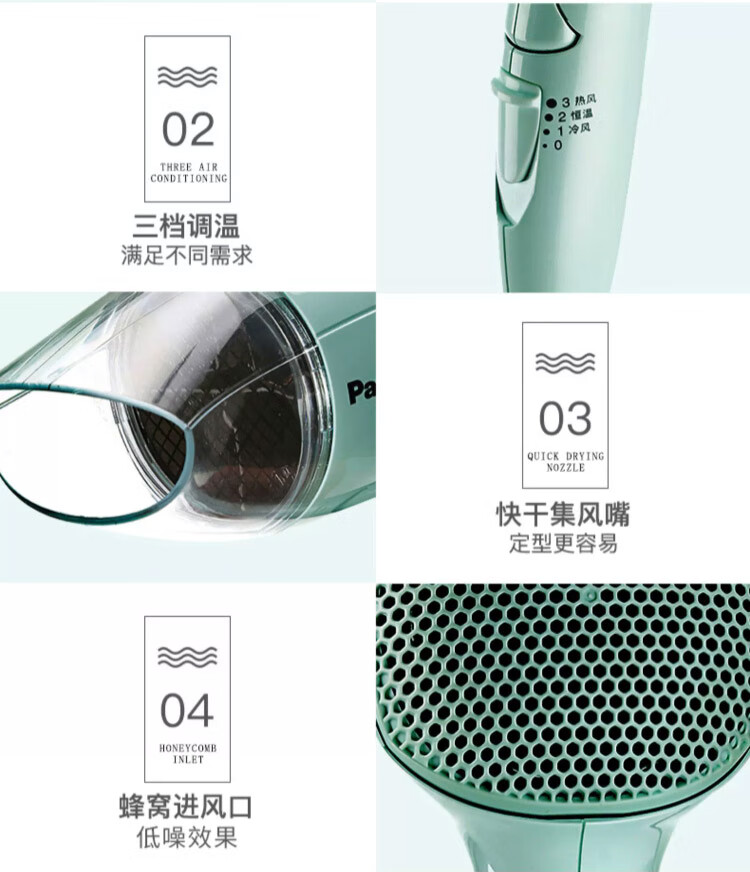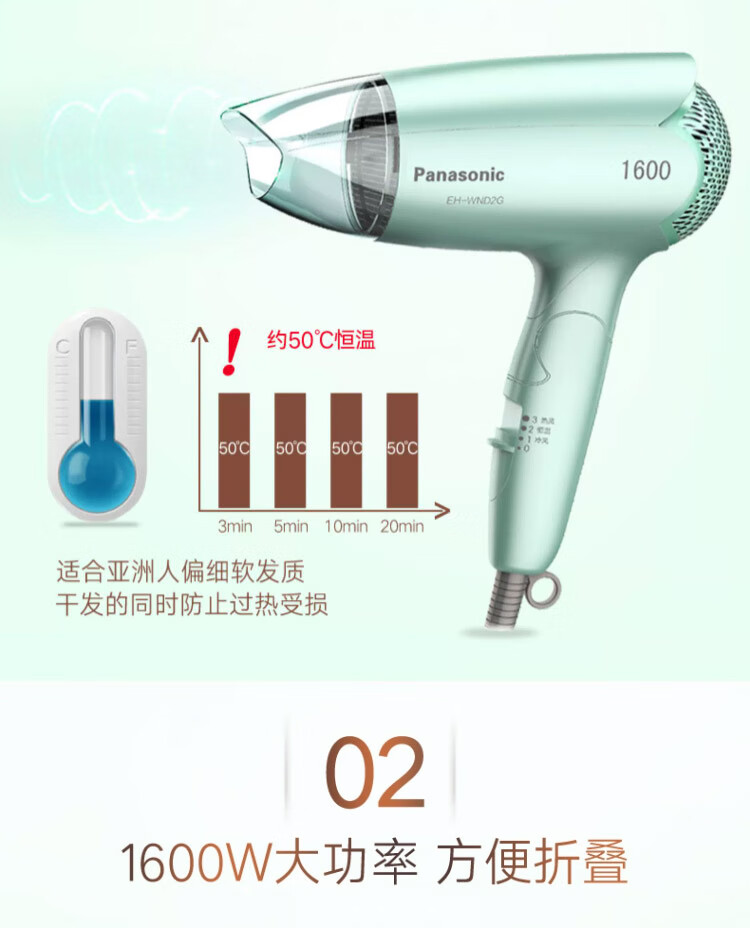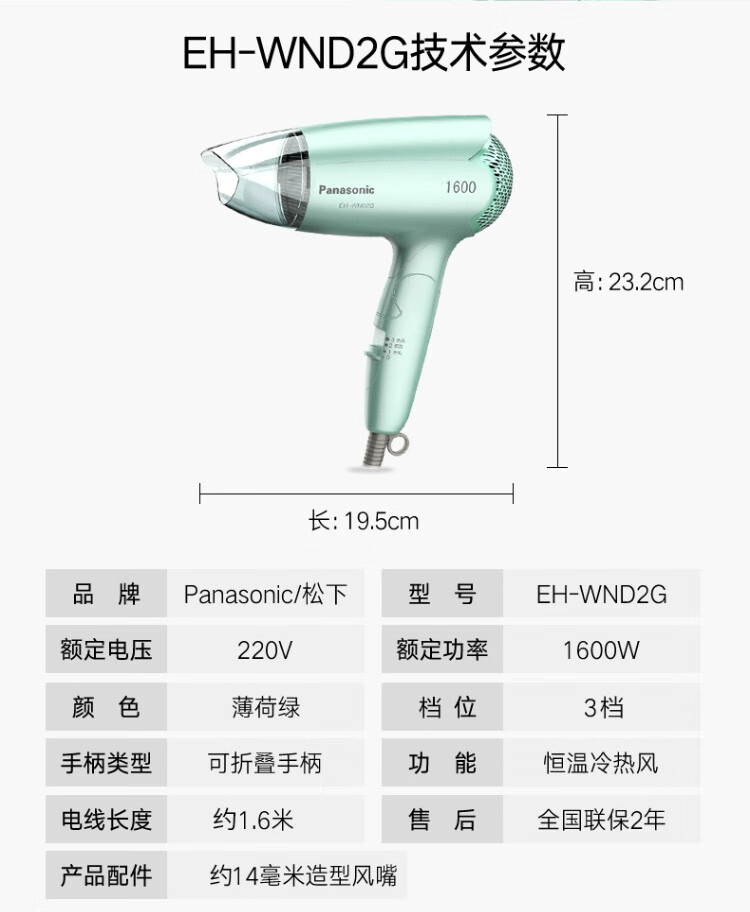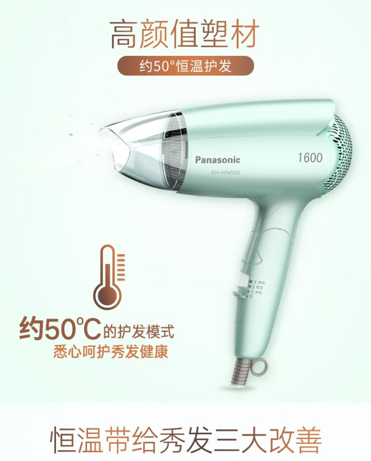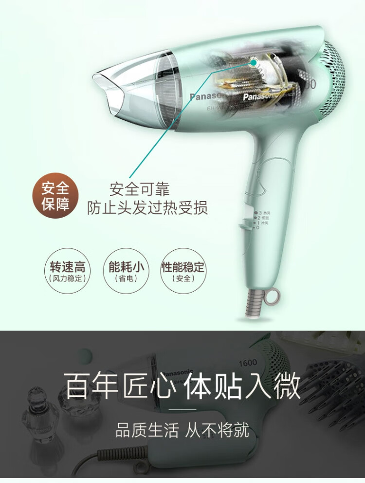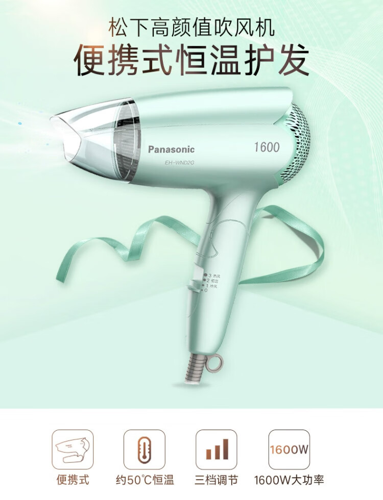 松下(Panasonic)电吹风家用大功率 大风力速干折叠便携吹风机 女友七夕情人节礼物吹发护发电吹风筒 EH-WND2G