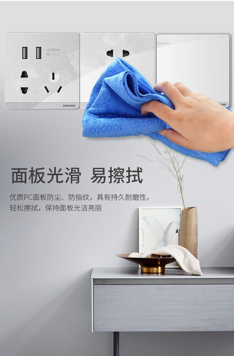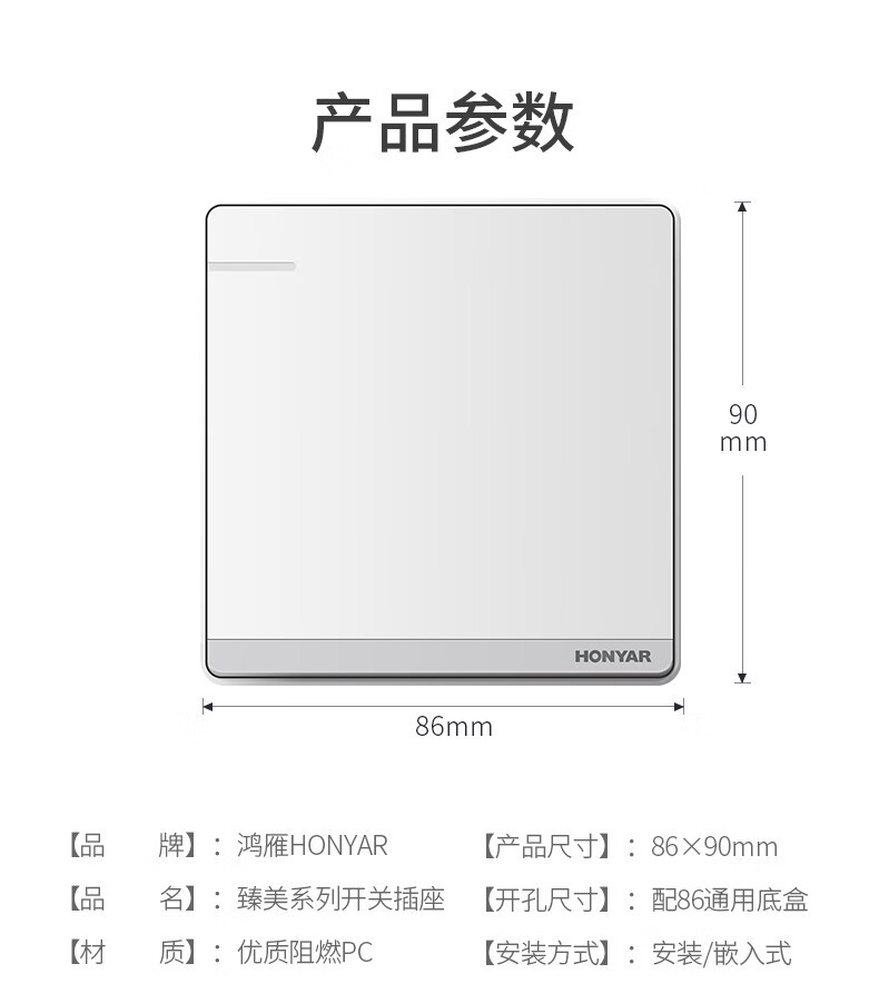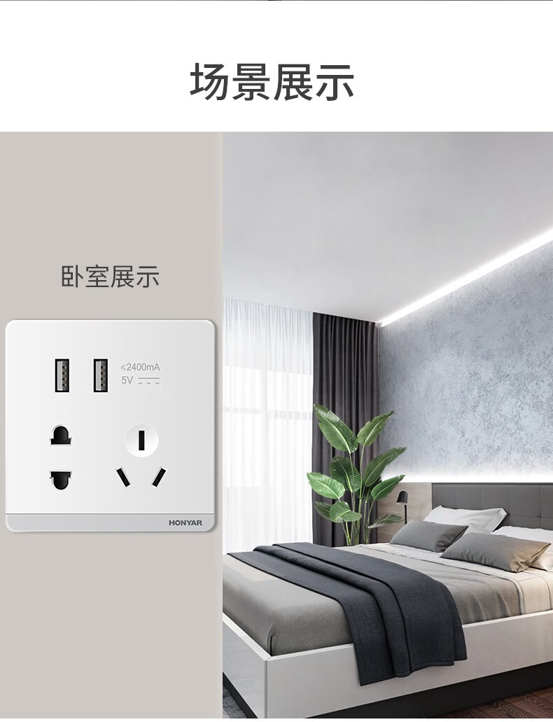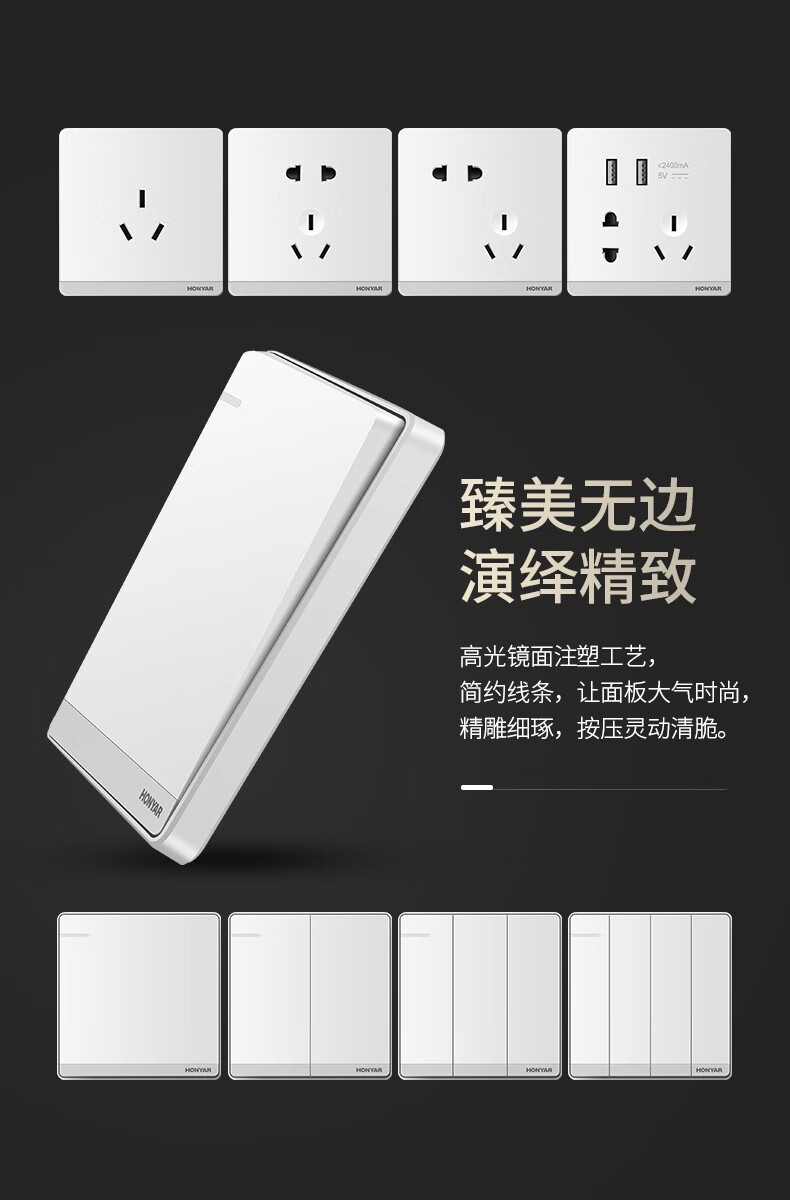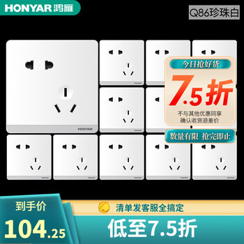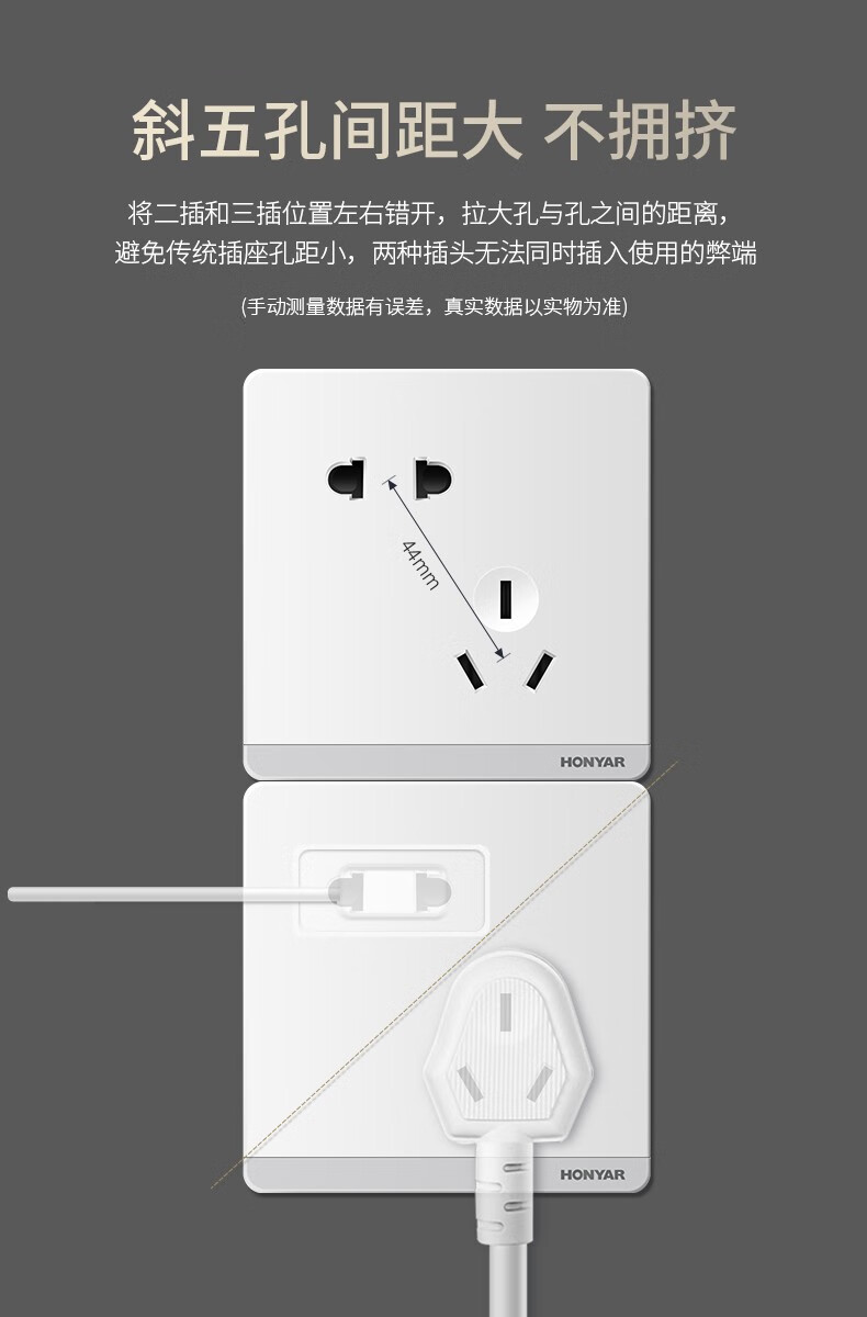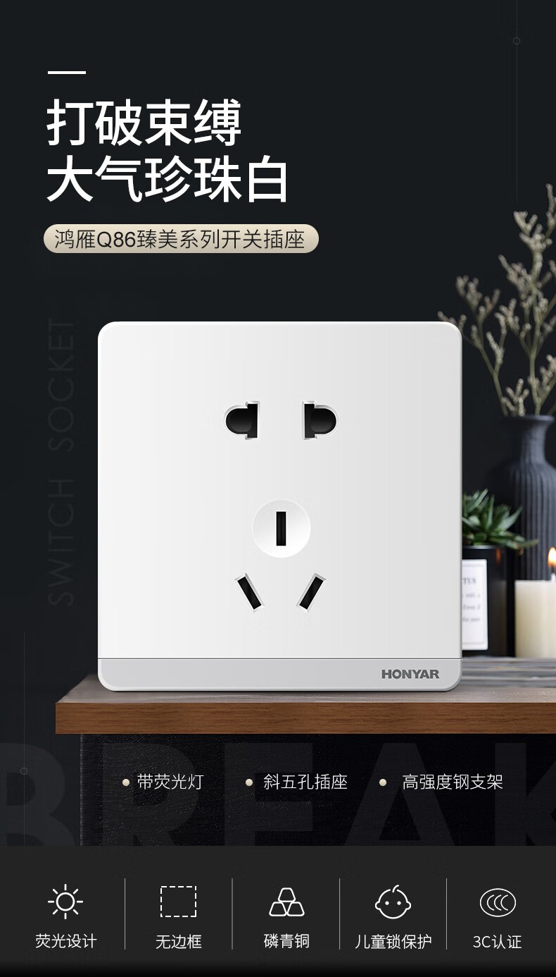 鸿雁(HONYAR)开关插座86型墙面暗装电源5孔无边框大板白10a五孔USB三孔家用开关Q86白色 斜五孔10只装